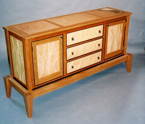 A long console of Cherry, carved Birdseye Maple and Stone on a Cherry stand.